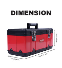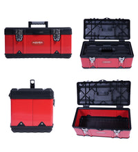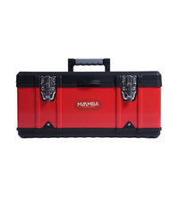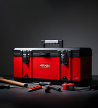 صندوق أدوات من البلاستيك والفولاذ مزود بقفل معدني.